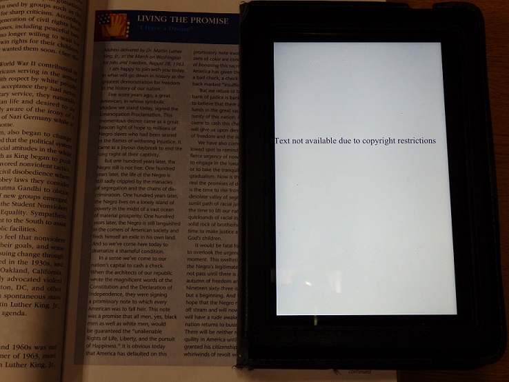 Why is this? Well, I’m not privy to the details, but it appears the estate of Martin Luther King Jr. gave permission for his famous “I Have A Dream” speech to be reproduced in its entirety in the print edition of the textbook, but withheld that same permission for the e-book edition of the textbook (for reasons unknown to me).